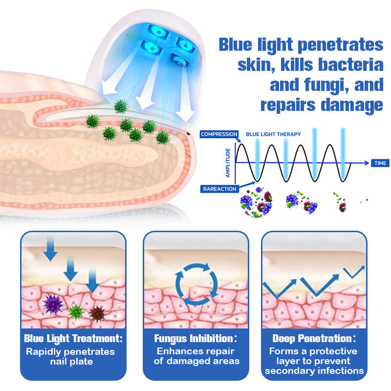 A kékfény-terápia egy olyan orvosi technika, amely a körmök kezelésére 470 nm hullámhosszú kék fényt használ. Ez képes áthatolni a köröm külső rétegén, és fotodinamikus reakciót vált ki a köröm keratinjában. Ez a reakció káros oxigén szabadgyökök képződéséhez vezet, amelyek hatékonyan képesek a köröm közelében lévő baktériumok és gombák ellen harcolni és elpusztítani azokat, csökkentve a gyulladással járó fertőzéseket, és enyhítve a gyulladás helyén jelentkező tüneteket, például a bőrpírt, a meleget és a fájdalmat. Fontos, hogy elősegítheti a károsodások alapvető helyreállítását anélkül, hogy mellékhatásokat vagy gyógyszerrezisztenciát okozna.